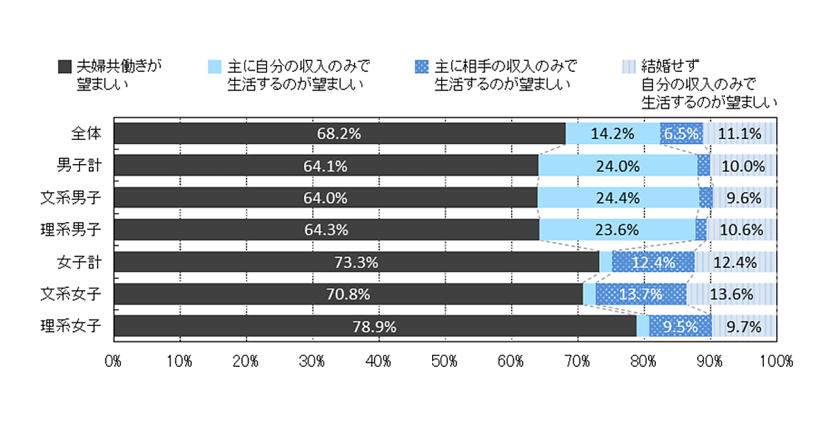 将来への展望として「結婚後の仕事」について聞くと、「共働き」を68.2%が希望。男子は64.1%、女子は73.3%で、男子は2016年卒の調査開始以来、初めて6割を突破した。「結婚せず自分の収入のみで生活」は、男子10.0%、女子12.4%で、こちらも最高値を更新した。