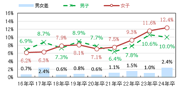 なお女子に「共働きを希望する理由」を聞くと、「仕事を続けることが生きがいになると思うから」15.3%は前年から2.4pt減少。2位「仕事でキャリアを積みたい(出世したい)から」14.4%は前年から2.6pt増加、過去最高を記録し逆転間近だ。