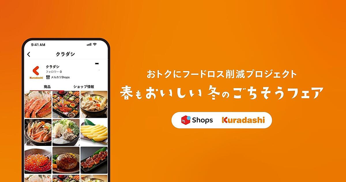 プロジェクトの第1弾で「春もおいしい 冬のごちそうフェア」をメルカリShopsで3月13~22日に開催する。約700種類の商品を用意し、商品が100円引きになるクーポンを配布する。併せて期間限定の実店舗「メルカリShops×Kuradashiコラボ ポップアップストア」を3月13~15日に東京都品川区の戸越銀座商店街に出店する。今後、季節に応じて第2弾を実施する。