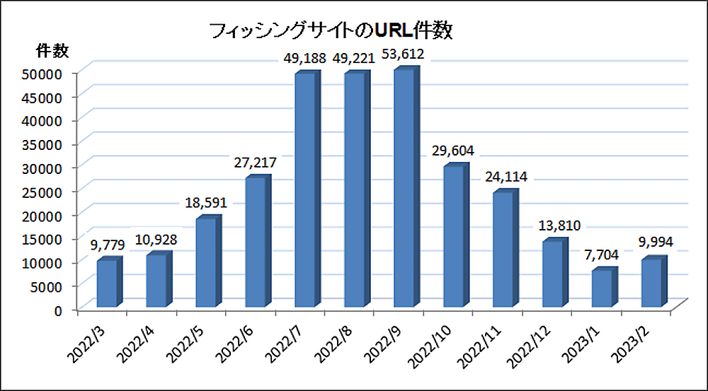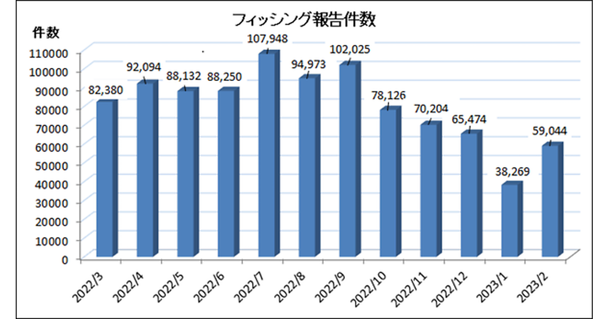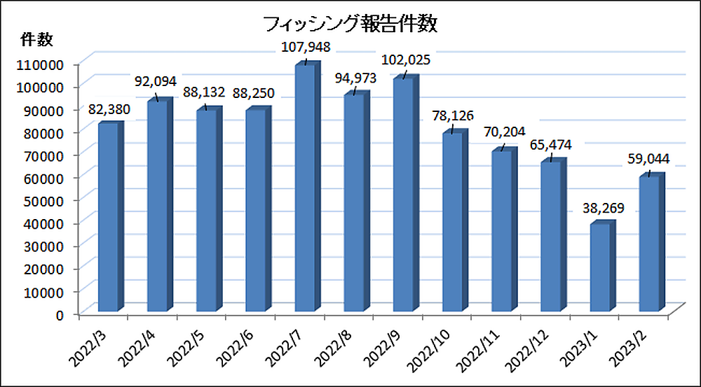 2023年2月のフィッシング報告件数(海外含む)は、前月38,269件より大幅に増加し59,044件となった。ここ数か月減少が続いていたが、ほぼ半年ぶりに増加を見せた。