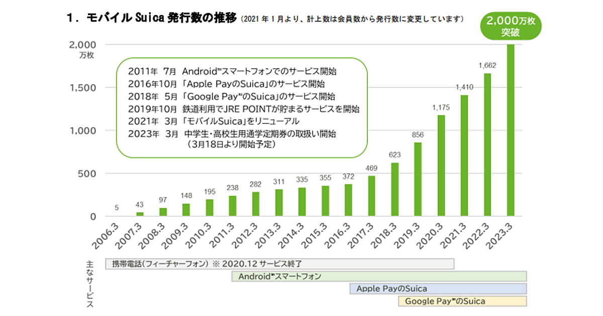 JR東日本は、IC乗車カード「Suica(スイカ)」の機能を携帯情報端末に搭載する「モバイルSuica」の発行数が3月11日に2000万枚を超えた、と3月14日発表した。2006年1月28日のサービス開始から17年余りで達成した。特に近年発行数の伸びが大きくなっている。2000万枚を記念して3月22~31日に謝恩キャンペーンを実施する。