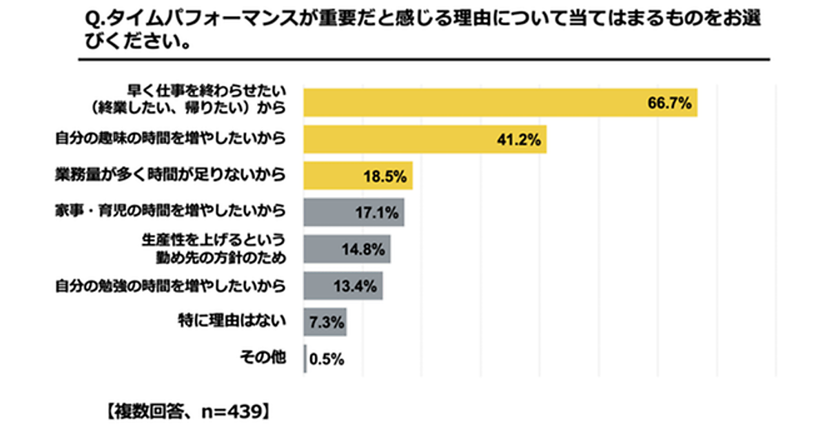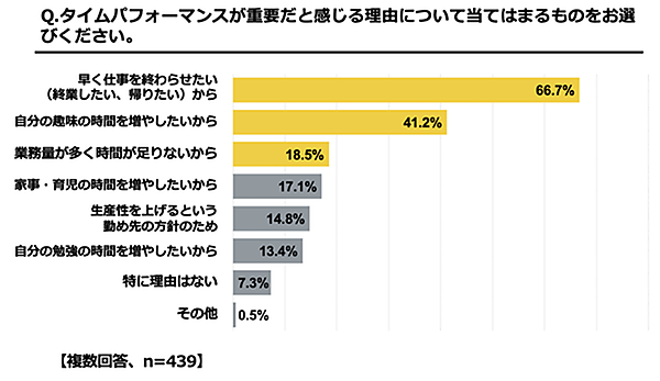 まず「日々の仕事においてタイパ(タイムパフォーマンス)は重要ですか?」と聞くと、87.8%が「重要+どちらかというと重要」と回答。その理由については「早く仕事を終わらせたい(終業したい、帰りたい)から」66.7%が特に多く、以下「自分の趣味の時間を増やしたいから」41.2%、「業務量が多く時間が足りないから」18.5%が続いた。