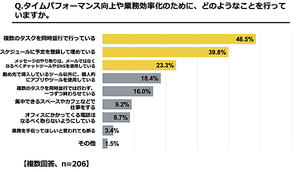 「タイパ向上のために個人的に行っていることはあるか」を聞くと、全体の46.9%が「ある」と回答。「具体的に行っていること」では「複数のタスクを同時並行で行っている」48.5%、「スケジュールに予定を登録して埋めている」39.8%、「メッセージのやり取りは、メールではなくなるべくチャットツールやSNSを使用している」23.3%が上位だった。