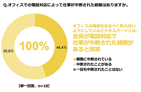 なお、「オフィスにかかってくる電話はなるべく取らないようにしている」8.7%といった回答もあった。そこでこれらビジネスパーソン18人に対して「オフィスでの電話対応によって仕事が中断された経験があるか」を聞くと、100%が「中断されたことがある」と回答。1日の業務時間のうち電話対応に割いている時間は「平均38.7分」、最大では「180分」という回答が寄せられた。