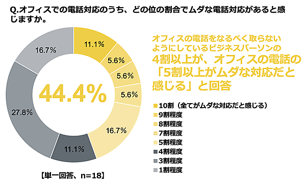 さらに「オフィスにかかってくる電話の内容はどのくらいムダか」を18人に聞くと、「全部(10割)」11.1%といった回答を含め44.4%が、「半分以上がムダな電話だ」と回答した。