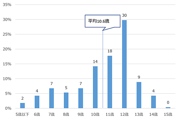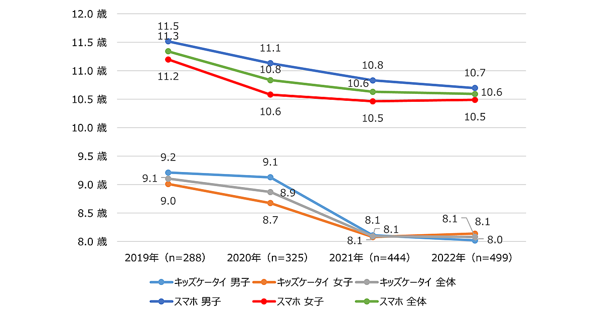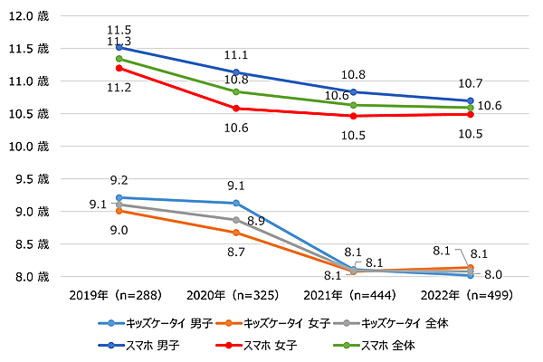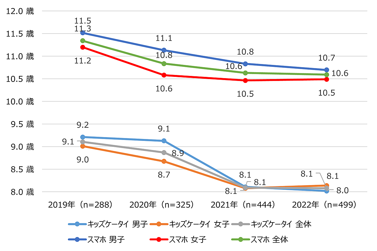スマホを所有している子(499人)に「いつから持ち始めたか」を聞くと、全体平均は「10.6歳」で前年と変わらず。ここ数年低年齢化が進んでいたが、下げ止まりを見せた形だ。またこれまで男子のほうが女子よりやや高かったが、その差も縮まっている。