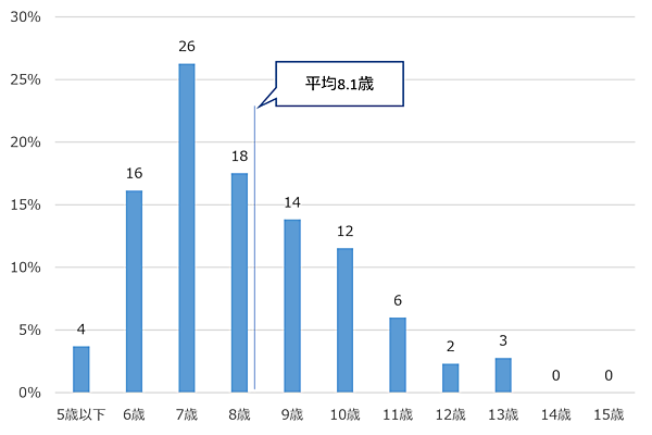 5歳~15歳ごとに「スマホ所有を開始した年齢」を見ると、最も多いのは「12歳」。中学校入学を1つの区切りに持ち始めるようだ。家族・親族から記念にプレゼントされるケースも多いと思われる。なお「キッズケータイ所有を開始した年齢」は「7歳」が最多で、これも小学校入学前後で持ち始める割合が多い。