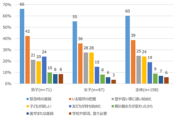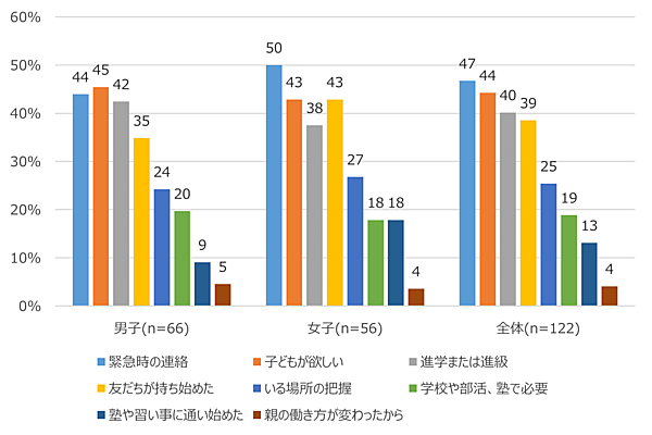 「中学生からスマホを持たせている理由」もおおむね同傾向だが、男子は「緊急の連絡のため」よりも「子から欲しいと言われた」が多くて1位となっている。「進学または進級」も理由上位だ。なお前年との比較では、男女差がなくなっているのが特徴だという。