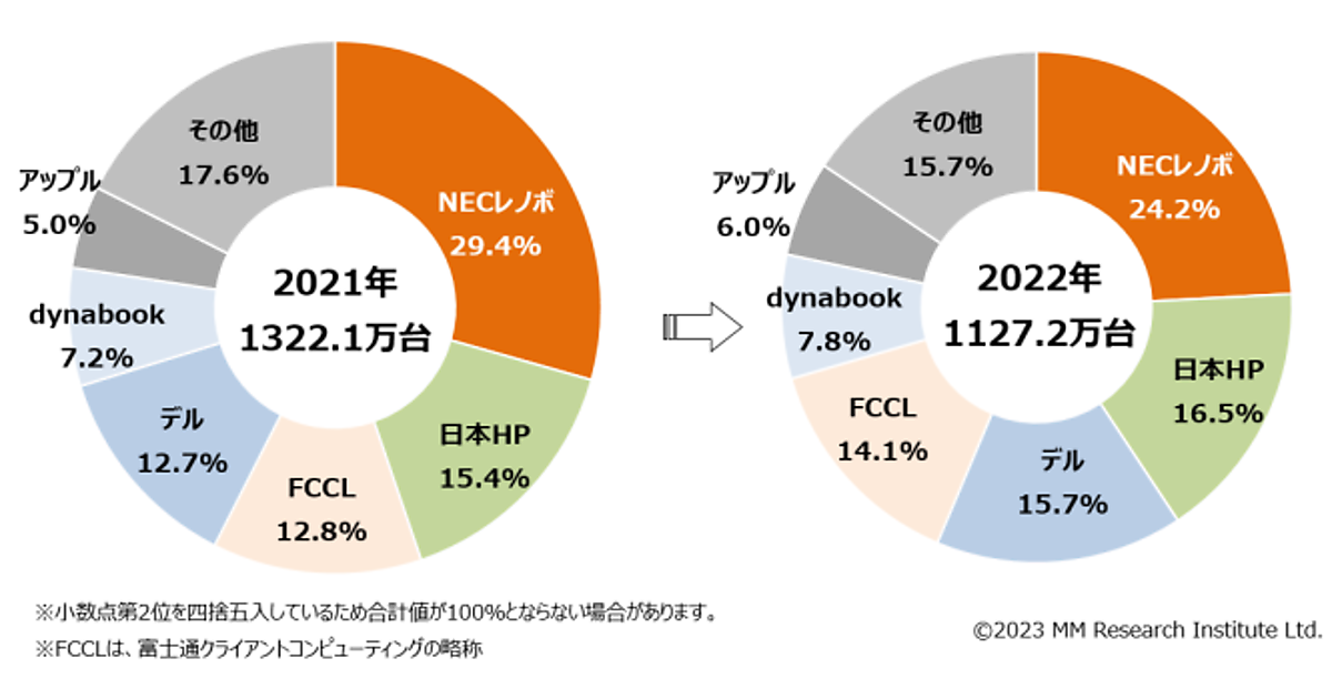 MM総研は「2022年暦年 国内パソコン出荷台数調査」を実施した。2022年1~12月の国内パソコン出荷台数と業界シェアについて調べている。