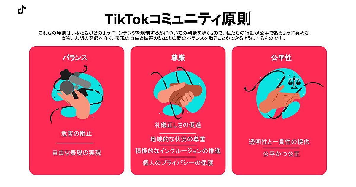 ガイドライン刷新の一環で「TikTokコミュニティ原則」も初めて公開した。人権擁護の取り組みに基づいて、表現の自由と危害の阻止の「バランス」▽人間の「尊厳」を尊重▽行動の「公平性」に重点を置いて、「危害の阻止」「自由な表現の実現」「礼節を守る」「地域特有の状況の尊重」「積極的なインクルージョンの推進」「個人のプライバシーの保護」「透明性と一貫性の提供」「公平かつ公正」――の8原則がある(図参照)。