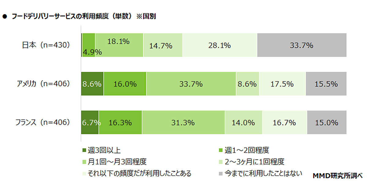 MMD研究所は「日米仏3ヶ国比較:都市部消費者の食の意識・動向調査」を実施した。日本(東京)、アメリカ(ニューヨーク)、フランス(パリ)に住む20歳~49歳の男女を対象に、フードデリバリーサービスの利用頻度や注文方法などについて聞いている。