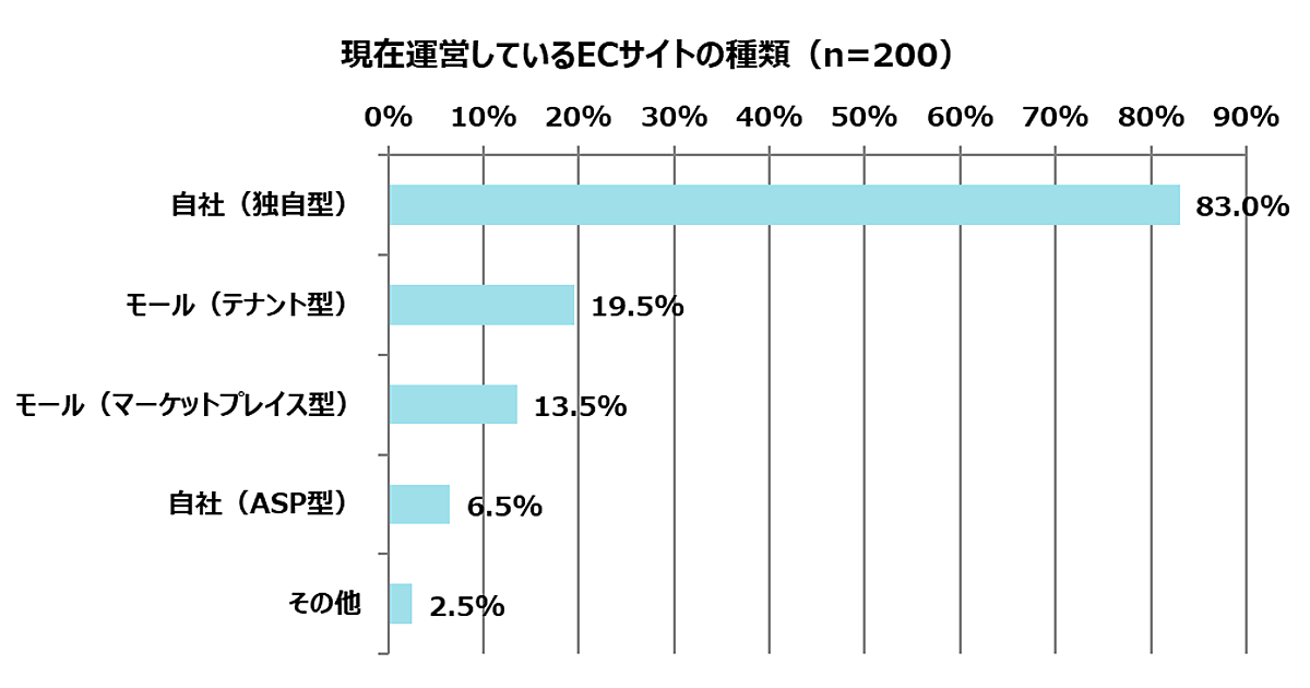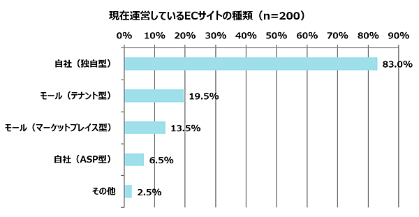まず「現在運営しているサイトの種類」(複数回答)を聞くと、「自社(独自型)」83.0%がほとんどで、「モール(テナント型)」19.5%、「モール(マーケットプレイス型)」13.5%は1割台にとどまる。なお「複数の種類のECサイトを運営している」としたのは19.5%だった。
