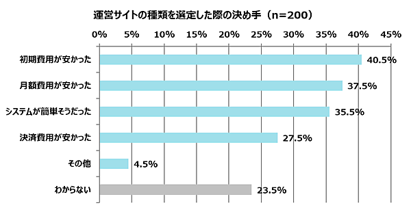 「運営サイトの種類を選定した際の決め手」では、「初期費用が安かった」40.5%、「月額費用が安かった」37.5%、「システムが簡単そうだった」35.5%が上位。ランニングコスト(継続費用)よりイニシャルコスト(初期費用)を優先した担当者がわずかに多い。