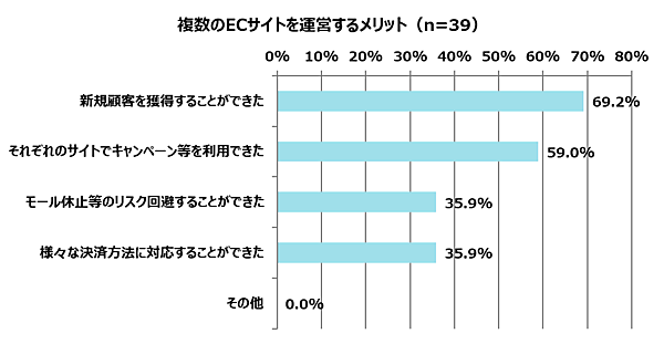 「複数の種類のECサイトを運営している」と回答した39人にそのメリットを聞くと、「新規顧客を獲得できた」69.2%、「それぞれのサイトでキャンペーン等を利用できた」59.0%が特に多い。「モール休止などのリスク回避」「多彩な決済方法への対応」という回答もともに3割以上があげている。