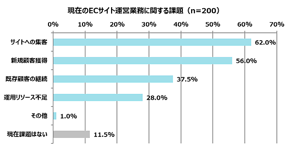 全体に「ECサイト運営に係る業務全般で感じている課題」を聞くと、「ない」としたのは11.5%にとどまり、9割近くがなんらかの課題を感じている。上位は「サイトへの集客」62.0%、「新規顧客獲得」56.0%、「既存顧客の継続」37.5%と、顧客管理に関するものが占めた。