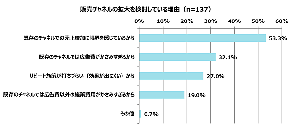 なお「販売チャンネルの拡大」については「検討している」が68.5%。その理由としては「既存のチャンネルでの売上増加に限界を感じているから」53.3%、「既存のチャンネルでは広告費がかさみすぎるから」32.1%、「リピート施策が打ちづらい(効果が出にくい)から」27.0%といった声があがった。