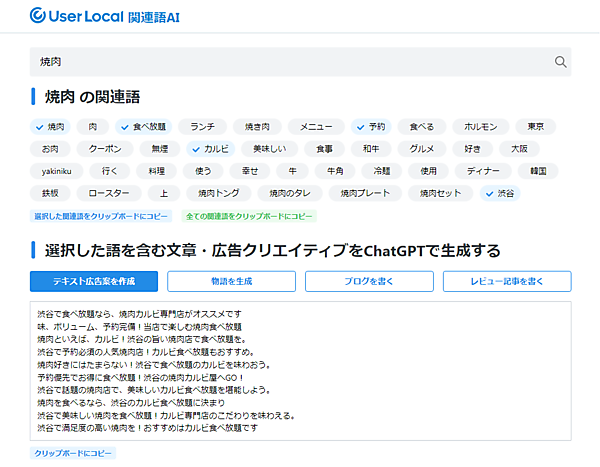 AI(人工知能)・ビッグデータ分析開発のユーザーローカルは、独自AIによって関連語を自動選出する「関連語AI」の無償提供を始めた、と3月24日に発表した。キーワードを入力するだけで時事用語を含めた関連するキーワードを瞬時にリストアップする。さらに関連語を選ぶだけで米国OpenAIが開発したチャットボット(自動応答システム)「ChatGPT」と連携して広告クリエイティブや文章を作成する。いずれも無料で利用できる。
