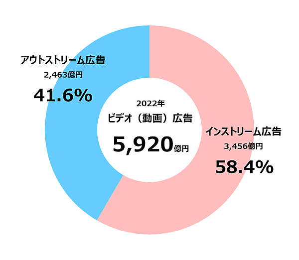 ビデオ(動画)広告費は5,920億円(前年比115.4%)で、インターネット広告媒体費全体の23.9%。そのうち動画コンテンツの間に挿入される「インストリーム広告」は3,456億円(構成比58.4%)で前年57.0%より構成比が増加。Web上の広告枠や記事コンテンツ面で表示される「アウトストリーム広告」は2,463億円(同41.6%)だった。なお取引手法別では運用型広告が83.4%を占めた。