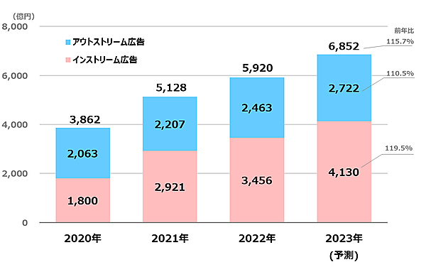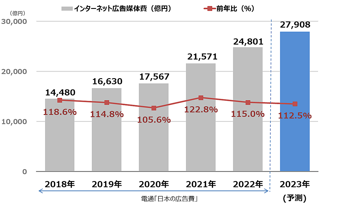 2023年のインターネット広告媒体費も引き続き堅調に推移する見込みで、前年比112.5%・2兆7,908億円と予測されている。ビデオ(動画)広告は前年比115.7%・6,852億円と予測された。