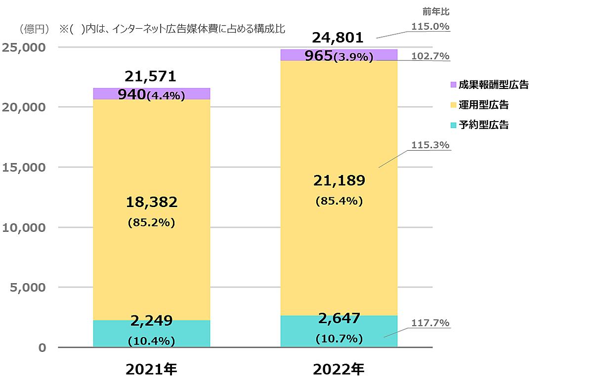 取引手法別では、運用型広告は2兆1,189億円(前年比115.3%)で、1947年の推定開始以降はじめて2兆円を突破した。予約型広告も前年比117.7%と伸長を見せている。
