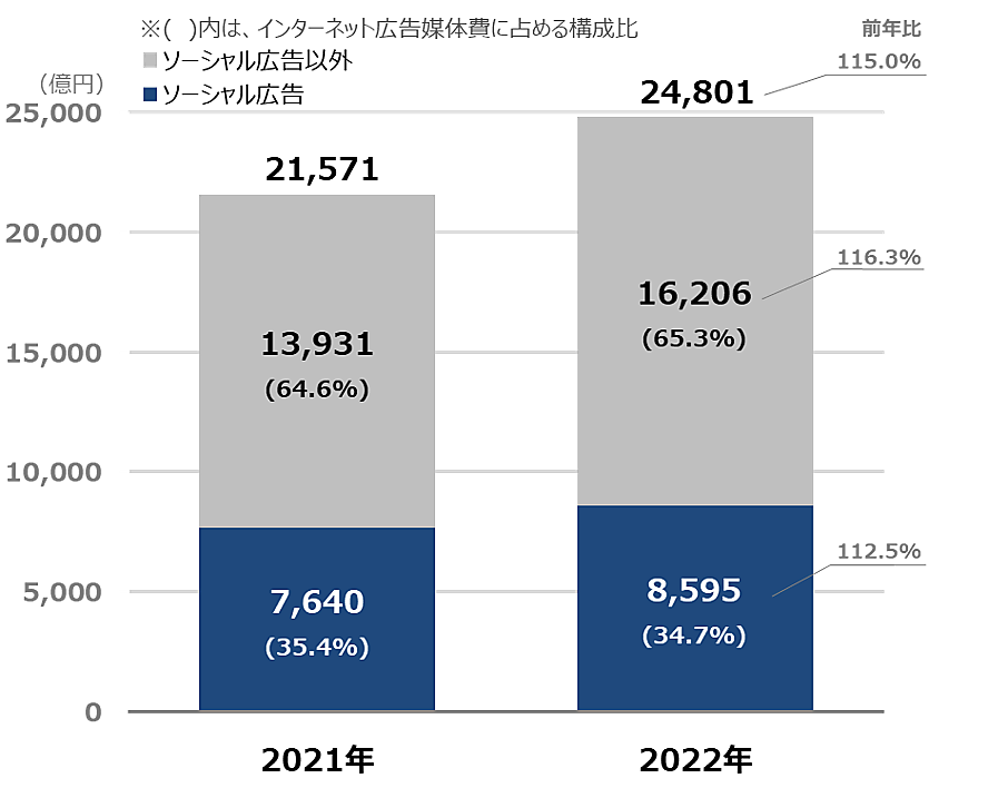 ソーシャルメディアサービス上で展開される「ソーシャル広告」は、前年比112.5%の8,595億円。インターネット広告媒体費全体の34.7%に達した。ソーシャルメディアの種類別では、引き続き「SNS系」3,675億円が最大を占めた。