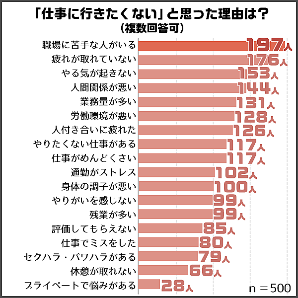 まず「仕事に行きたくないと感じたことがあるかどうか」を聞くと、95%が「ある」と回答。その理由を聞くと、「職場に苦手な人がいる」39.4%(197人)が最も多かった。以下「疲れが取れていない」35.2%(176人)が僅差で続いた。その他も、人間関係や労働環境、健康などをあげる人が多い。