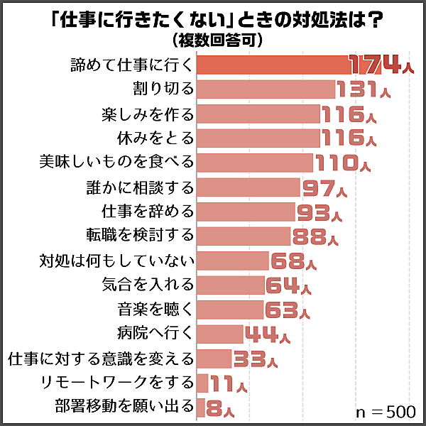 こうした状態への対処方法だが、「諦めて仕事に行く」34.8%(174人)、「割り切る」26.2%(131人)が上位だった。ただしそれに続いて「楽しみを作る」「休みをとる」が各23.2%(116人)で続いている。割り切って仕事に行く人も多いが、少しでもストレス発散して気分を持ち直すのが大切なようだ。