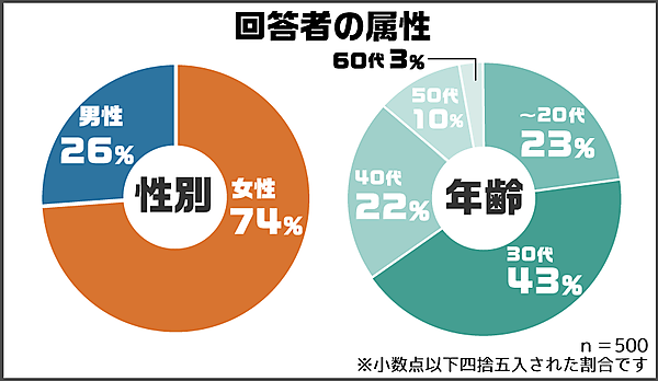 - 【調査人数】500人(女性74%、男性26%)