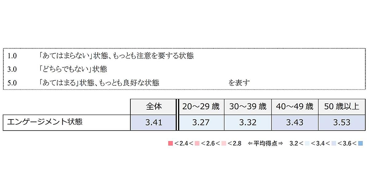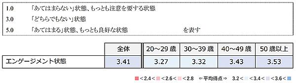 それによると、20代社員のエンゲージメントがもっとも低く(3.27)、年代が上がるほどエンゲージメントが高いことが判明した。