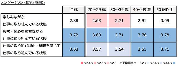 またエンゲージメントは「(1)楽しみながら仕事に取り組んでいる」「(2)興味・関心をもちながら仕事に取り組んでいる」「(3)自分の仕事に意義を感じている」という3つの状態で構成される。各項目を年代別で見ると、20代・30代において「(1)楽しみ」の得点が特に低かった。「興味・関心」や「意義」は感じているが、楽しんでいないと考えられる。