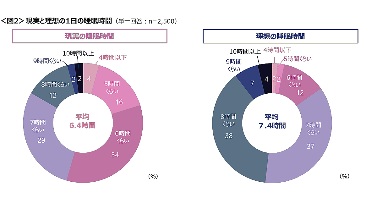 まず、平日と休日を合わせた睡眠時間の充足度を聞くと、合計で51%の人が「足りている」と回答した。年代別にみると、「足りている」が最も多いのは60代、最も少ないのは40代となった。また、1日の睡眠時間の平均は6.4時間であったが、理想の睡眠時間は平均7.4時間となり、1時間のギャップがあることがわかった。