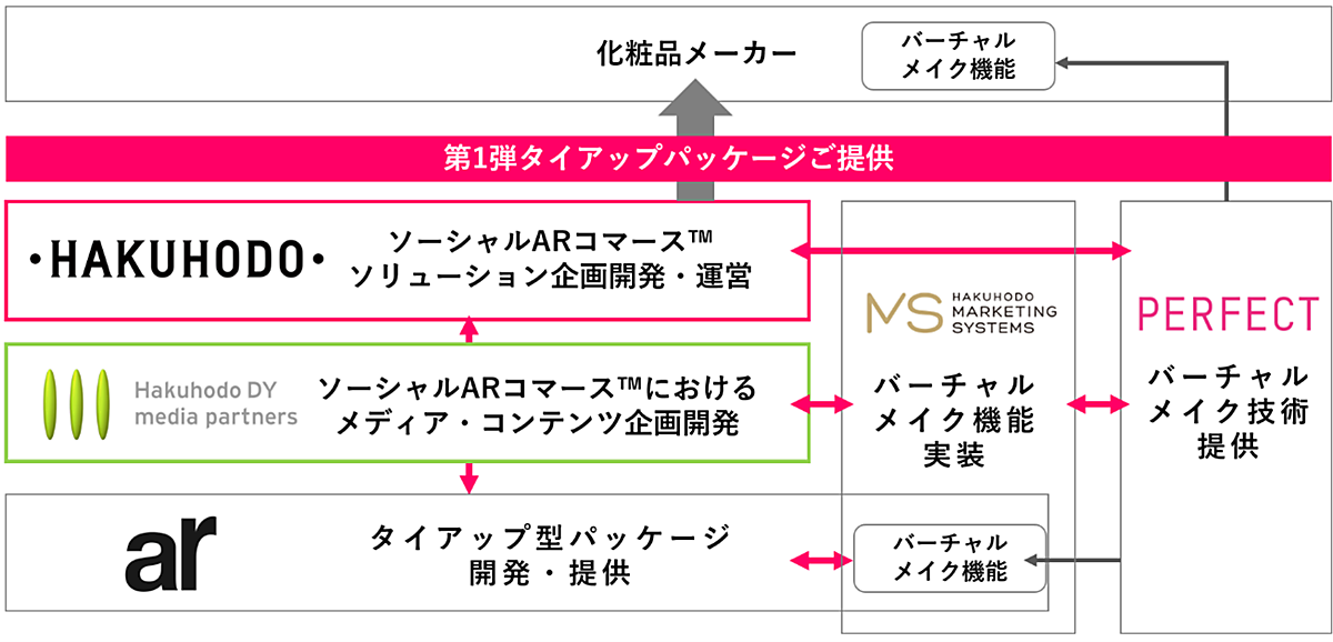 arのタイアップ型パッケージでは、化粧品メーカーの商品を使った推奨メイクパターンをインフルエンサーが自らのSNSアカウントで紹介し、arのタイアップ記事サイトでバーチャルメイク体験ができることを告知。ユーザーはバーチャル体験で気になる商品があれば「まとめ買い」(個別購入も可)を選択。化粧品メーカーのECサイトに誘導され、選んだ商品はECサイトのカートに引き継がれる。