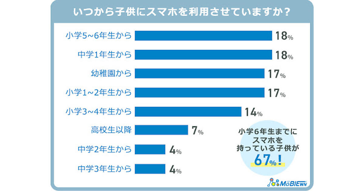 まず、子供にスマホを持たせ始めた時期を聞くと、全体では約67%の親が「小学6年生までにスマホを持たせている」と回答した。内訳をみると、「小学校5~6年生から」は18%、「幼稚園から」「小学校1~2年生から」はそれぞれ17%となり、比較的ばらけている傾向だった。