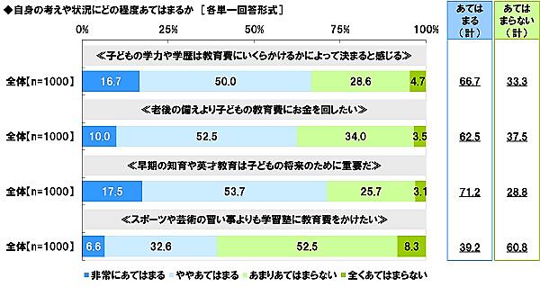まず「子どもの学力や学歴は、教育費によって決まるか」と聞くと、「非常にあてはまる」16.7%、「ややあてはまる」50.0%で、7割近くが関係性を実感。「老後の備えより子どもの教育費にお金を回したい」は「あてはまる+ややあてはまる」が62.5%、「早期の知育や英才教育は子どもの将来のために重要だ」は71.2%だった。しかし「スポーツや芸術の習いごとよりも学習塾に教育費をかけたい」は39.2%にとどまる。また親の8割半が「多少費用がかさんでも大学等へ進学させたい」と考えていた。