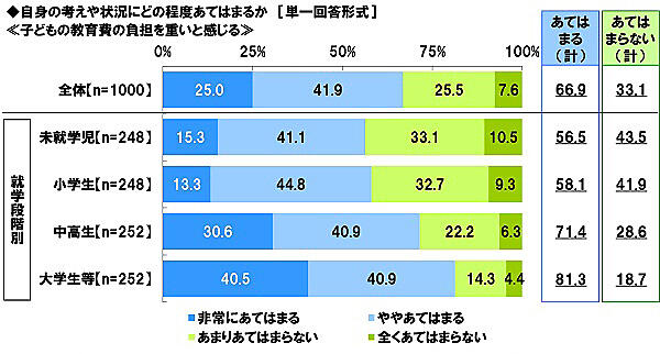 ソニー生命保険は、「子どもの教育資金に関する調査」の結果を発表した。教育や教育資金に関する意識、コロナ禍による家計や教育への影響、子育て・教育に関する支出の実態、大学等の学費や奨学金に関する意識などへの不安を中心に、大学生以下の子どもがいる1,000人が回答している。
