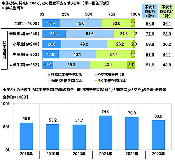 ここから全回答者に「子どもの将来に関する項目」を提示し「どの程度不安を感じるか」を聞いた。まず「学校生活」に対しては全体の63.9%が「不安を感じる」としており、就学段階別では、未就学児の親(77.0%)がもっとも高かった。なお全体の割合は、コロナ禍を背景とした2021年74.0%をピークに、2022年70.8%、2023年63.9%と、親の不安感は減少傾向にある。