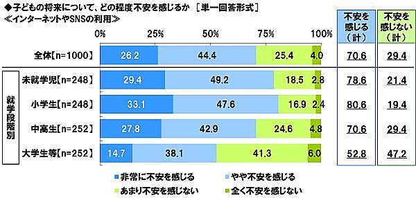 次に「子どものインターネット・SNS利用」に対しては、「不安を感じる」は70.6%。就学段階別では、未就学児の親(78.6%)と小学生の親(80.6%)が特に高かった。