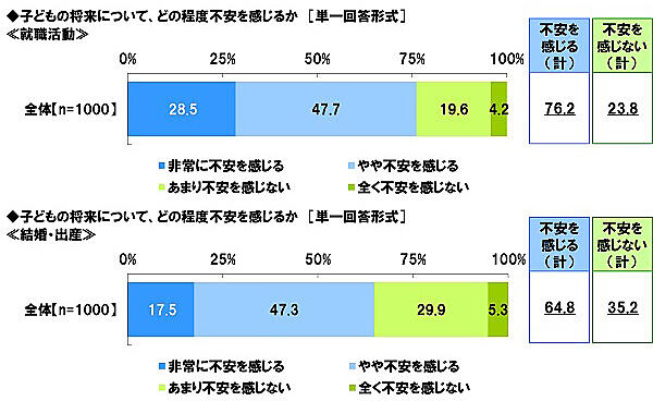 さらに「就職活動」に対しては76.2%、「結婚・出産」に対しては64.8%が不安を感じているなど、かなり先の将来に対しても7割前後の親が何らかの不安を抱えていることが明らかとなった。ここにあげられた項目に限ると、「受験・進学」がやはり悩みの種のようだ。