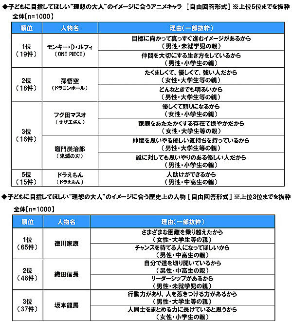 アニメキャラでは、1位「モンキー・D・ルフィ(ONE PIECE)」、2位「孫悟空(ドラゴンボール)」、3位「フグ田マスオ(サザエさん)」「竈門炭治郎(鬼滅の刃)」が上位。歴史上の人物では、1位「徳川家康」、2位「織田信長」、3位「坂本龍馬」が上位だった。しっかりしていて誠実な印象がある人物、目標に向かって頑張る人物が人気のようだ。