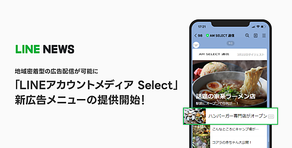 LINEは、スマートフォン向けニュース配信サービス「LINE NEWS」のローカルメディアや専門メディアを対象にしたプラン「LINEアカウントメディア Select(AM Select)」で、新たな広告メニュー「DIGEST Spot for LINEアカウントメディア Select」の提供を4月1日に始める、と3月31日発表した。地域密着型の広告が配信できる。