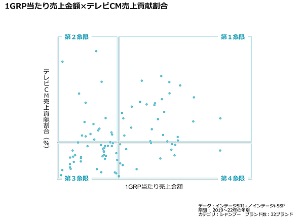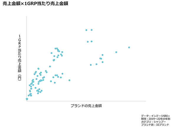 それによると、まず「ブランドの売上規模が大きいほど、投資に対して得られる売上金額が大きい」ことが確認された。ランドの売上金額(横軸)と1GRP当たりの売上金額(縦軸)の関係性を示したプロットを見ると、ブランドの売上金額が大きいほど、1GRPで得られる売上金額も大きくなる傾向が見られた。なお「GRP(Gross Rating Point)」とは延べ視聴率のことで、視聴率1%の番組に、テレビCMを1本流した場合、1GRPと換算する。