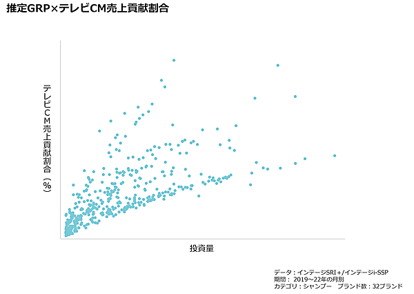 次に「各ブランドの売上に占めるテレビCMの貢献割合は、投資量に応じて増加していく」ことも判明した。投資量(横軸)と各ブランドの売上に占めるテレビCM貢献金額割合(縦軸)を見ると、投資量の増加にともない売上貢献割合が高まる傾向が見られた。