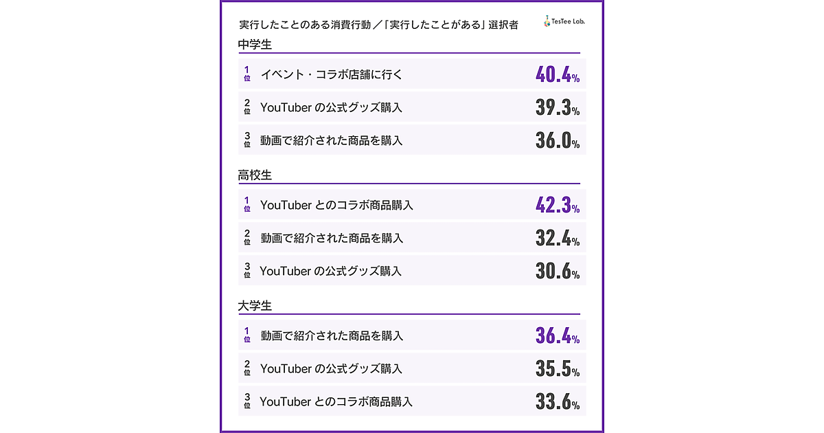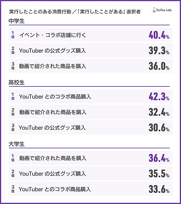 次に、消費行動を実行したことがあると回答した人を対象に「どんな消費行動を行ったのか」を聞くと、中学生・高校生・大学生で、中学生の第1位は「イベント・コラボ店舗に行く」、高校生の第1位は「YouTuberとのコラボ商品購入」、大学生の第1位は「動画で紹介された商品を購入」と、微妙な差異が見られた。