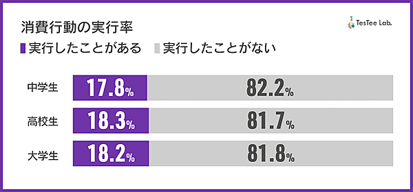 「YouTubeやYouTuberに関連することで、消費行動を実行したことがあるか(お金を使った経験があるか)」を聞くと、「実行したことがある」は中学生17.8%、高校生18.3%、大学生18.2%だった。だいたい2割弱が消費行動に影響を受けていた。