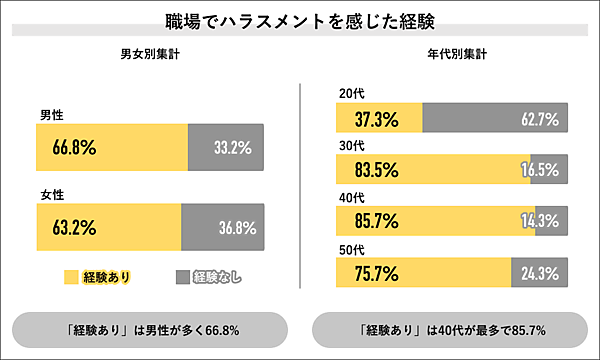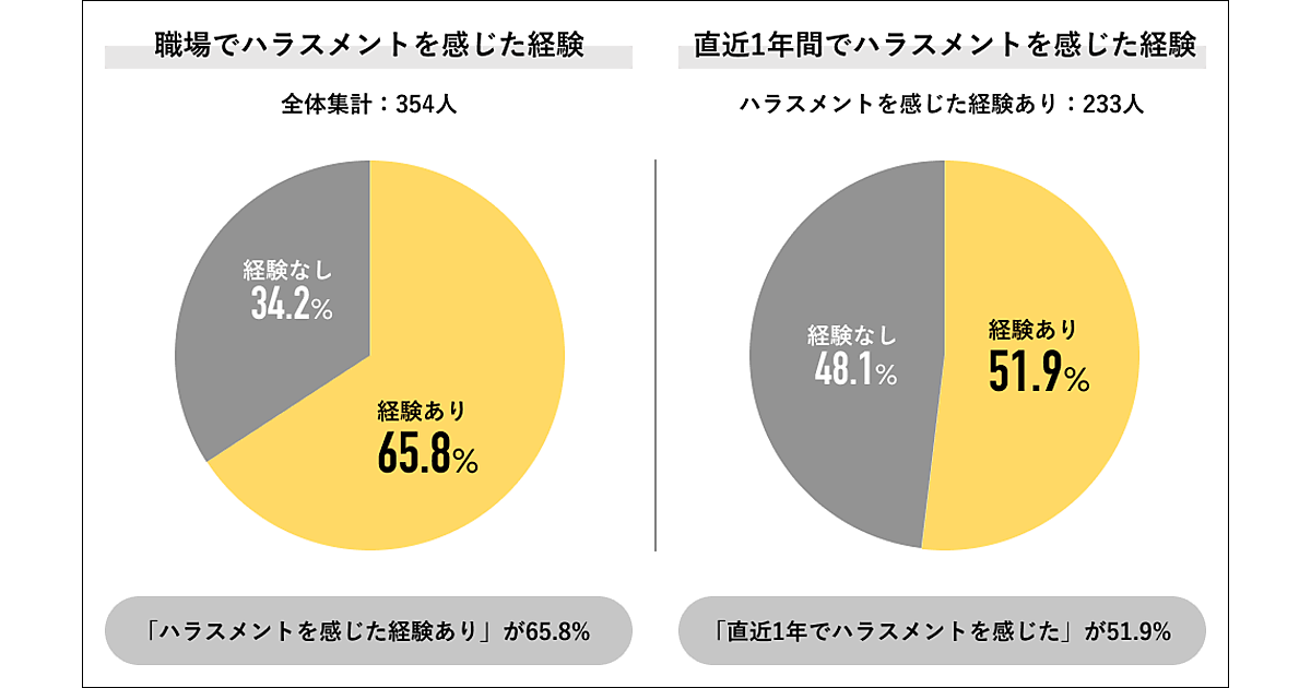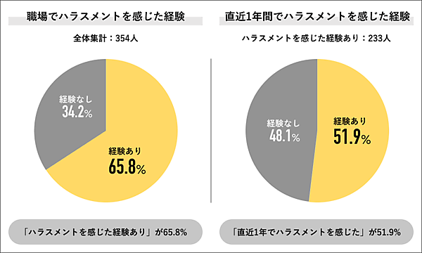 まず「ハラスメントを感じた経験」「直近1年間でハラスメントを感じた経験」を聞くと、全体の65.8%が「経験あり」。直近1年間に限っても「経験あり」は51.9%と半数を超えた。