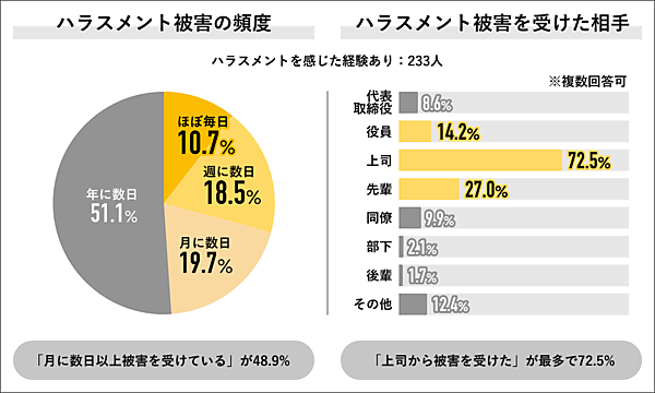 ハラスメントを感じた経験のある233人に、「被害の頻度」「加害者」などを聞くと、「ほぼ毎日」10.7%、「週に数日」18.5%、「月に数日」19.7%となり、ほぼ半数の人が「毎日~月に数日」で被害を受けている。