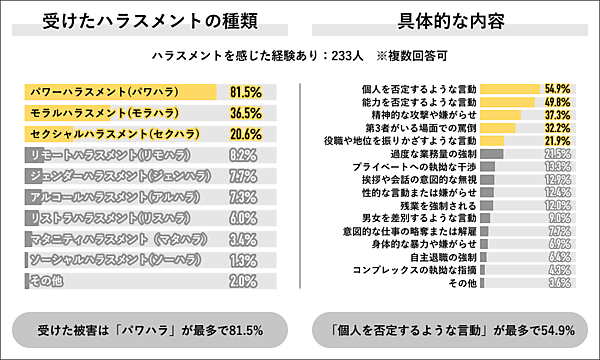 ハラスメントを感じた経験のある233人に「被害の種類」を聞くと、「パワーハラスメント(パワハラ)」81.5%が圧倒的に多く、「モラルハラスメント(モラハラ)」36.5%、「セクシャルハラスメント(セクハラ)」20.6%の倍以上の数値を示した。具体的には「個人を否定するような言動」54.9%が最も多い。