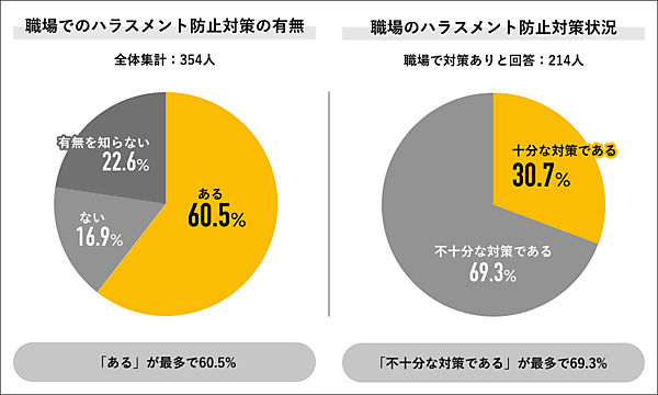 一方で「職場のハラスメント防止対策の有無」を聞くと「ある」60.5%が優勢だが、「その満足度」については69.3%が「不十分な対策である」としている。