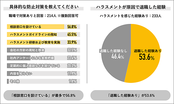 防止対策ありを回答した214人に「具体的な防止対策」を聞くと、「職場で相談窓口を設けている」56.8%、「ハラスメントガイドラインの周知」45.5%、「ハラスメント研修及び教育の実施」33.9%が上位だった。