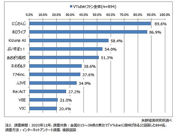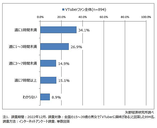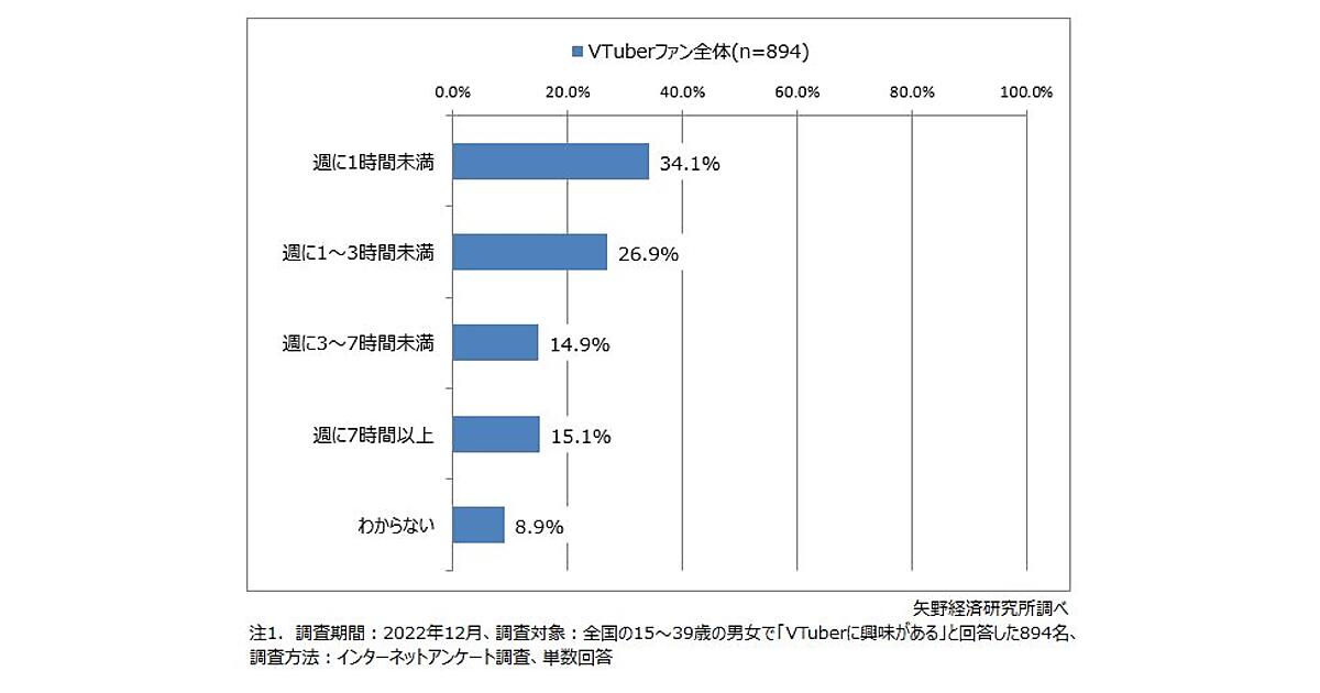 矢野経済研究所は、「VTuberファンの実態」に関する調査結果を発表した。インターネット・SNSの利用状況、VTuber関連動画の視聴頻度・時間など、VTuber事務所/プロジェクトの認知度や推し活状況、出費などについて、「VTuberに興味がある」とした15~39歳男女894人が回答している。